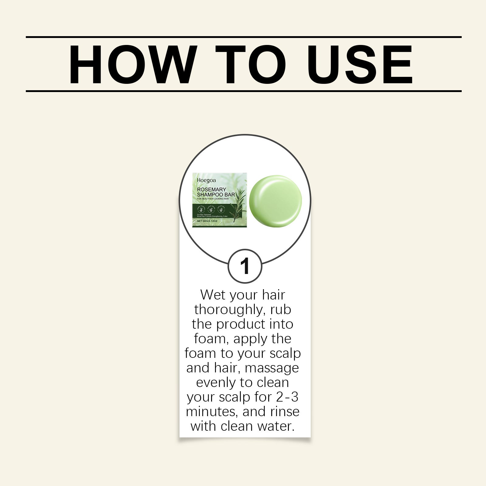 Frote la barra entre sus manos para crear espuma o directamente sobre el cuero cabelludo.
