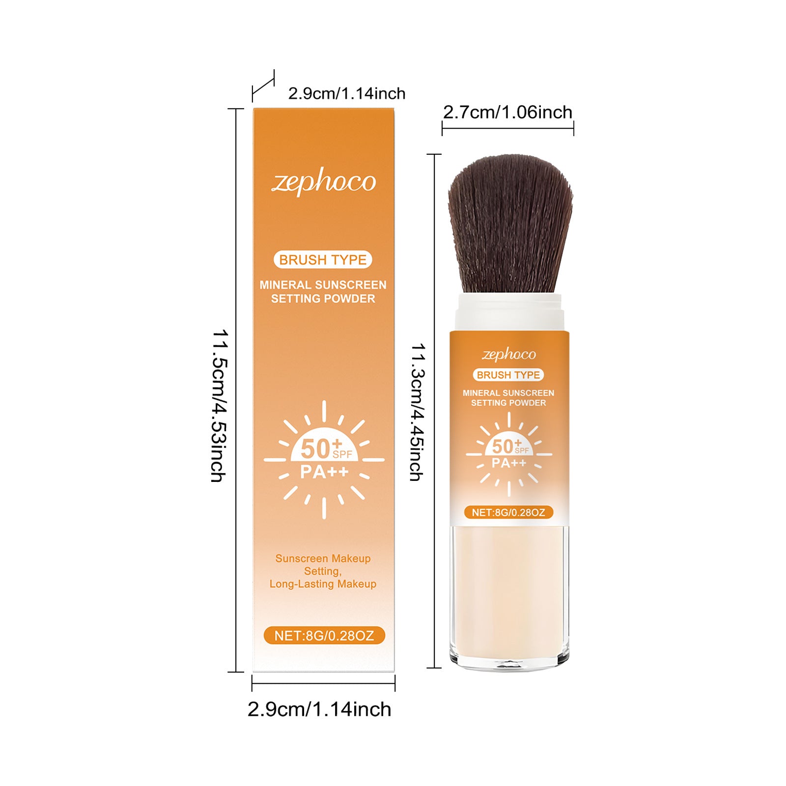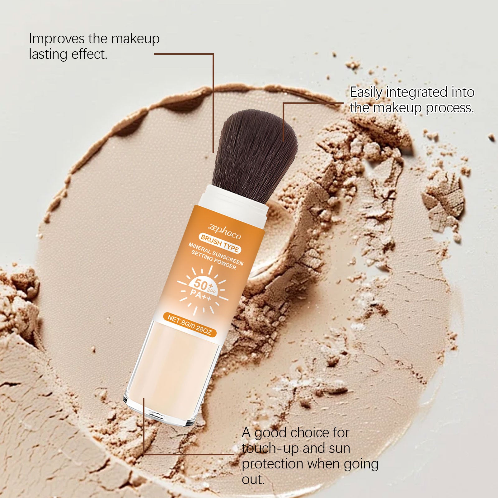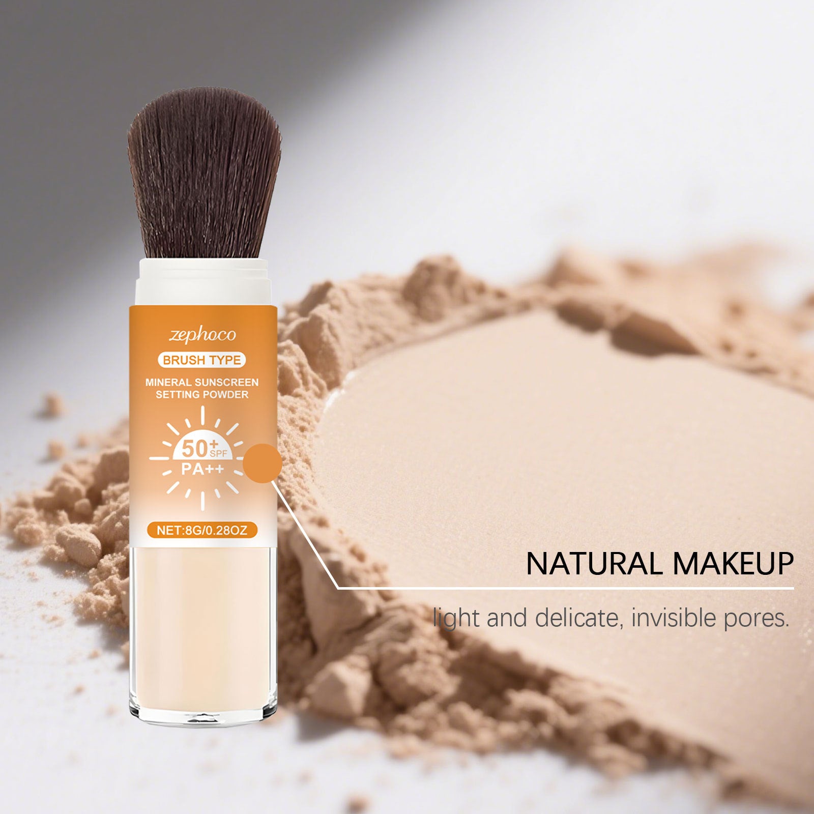 El polvo fijador mineral tipo brocha Zephoco está diseñado para realizar retoques de maquillaje prácticos con un acabado ligero y natural.