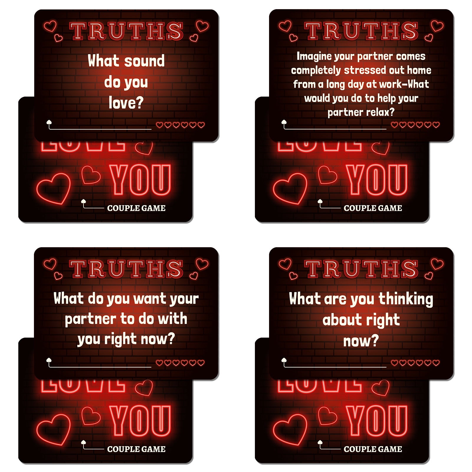 Les cartes « Je t’aime » sont conçues pour favoriser des conversations profondes et détendues entre les couples. Chaque carte propose une question « vérité » soigneusement formulée, destinée à encourager une communication ouverte et un échange partagé dans un cadre confortable.