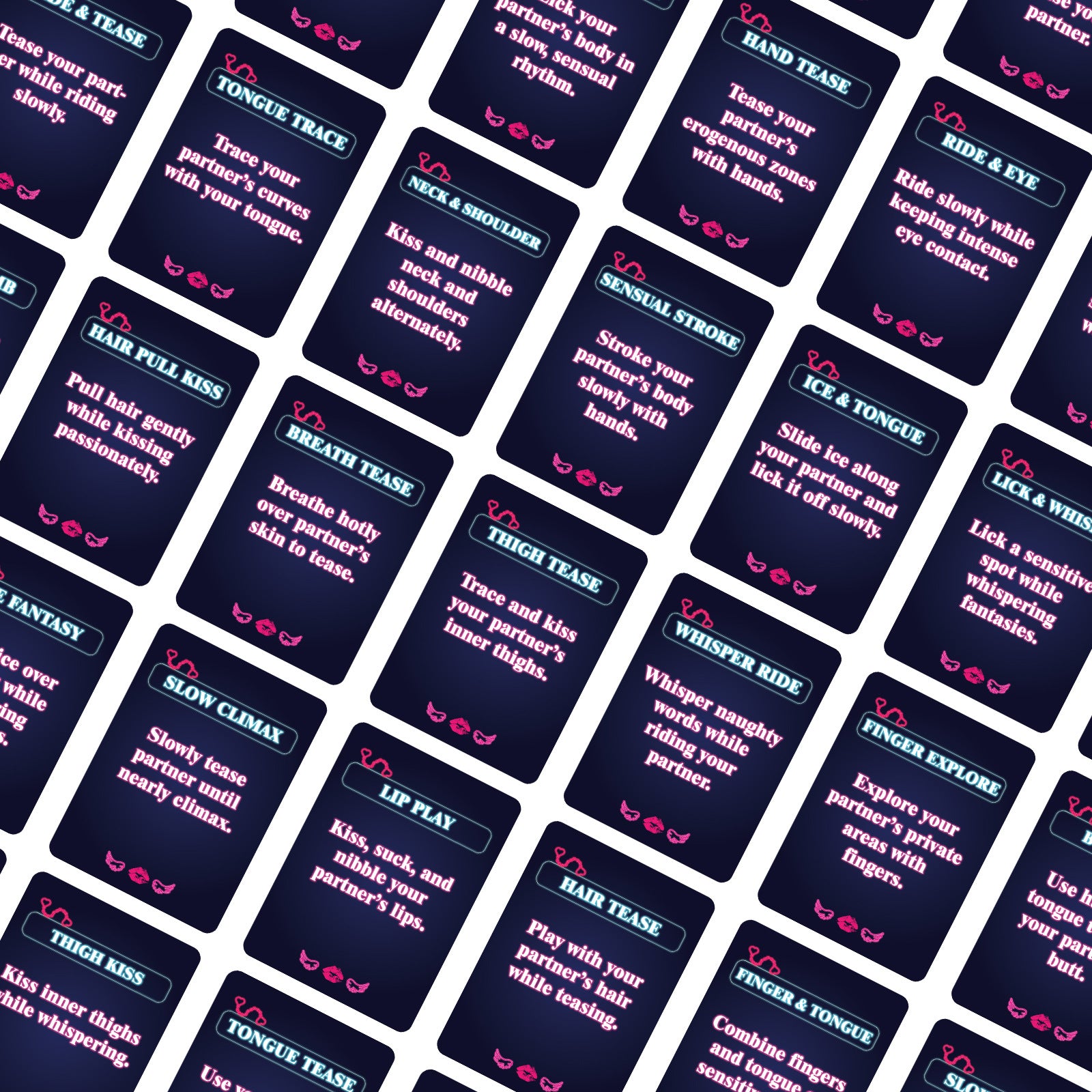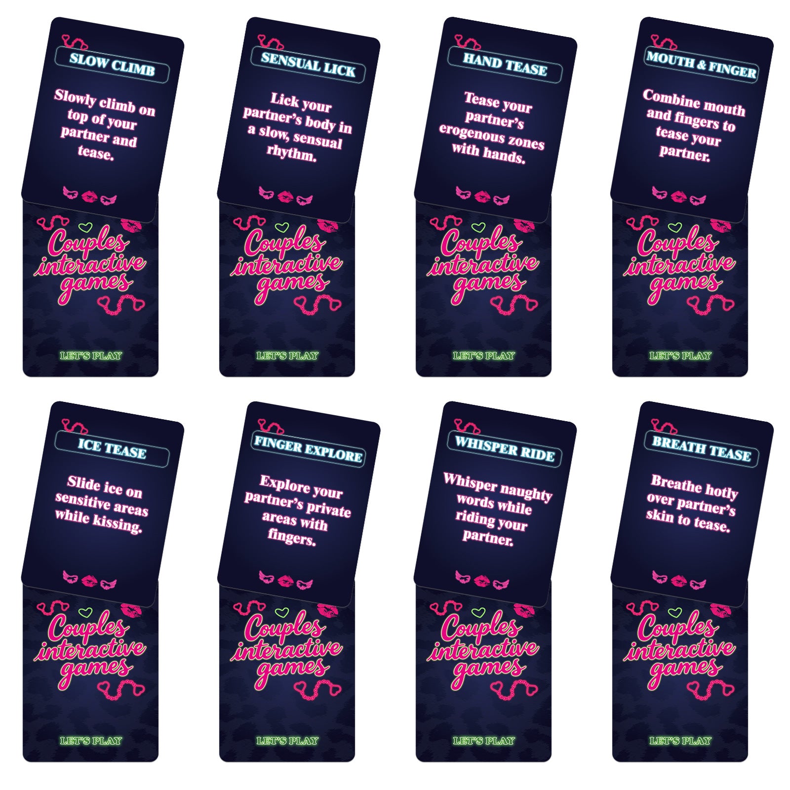 Les cartes de jeu interactives pour couples sont conçues pour aider les partenaires à explorer ensemble des moments ludiques, romantiques et intimes de manière amusante et captivante. Chaque carte propose un défi ou une suggestion amusante qui encourage la connexion, la communication et le partage d'expériences dans un cadre détendu et privé.