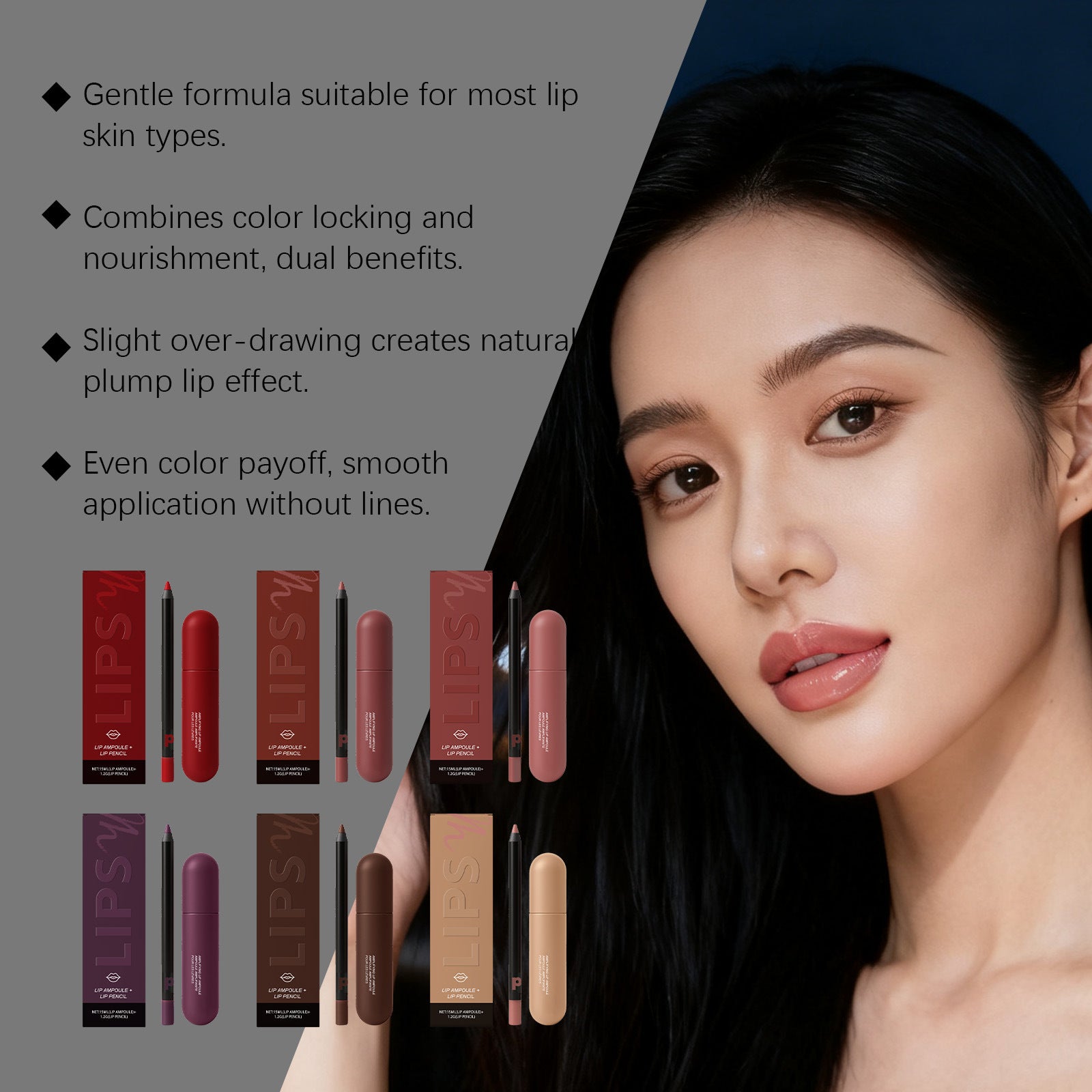 Ce duo ampoule et crayon à lèvres est conçu pour aider à créer une apparence lisse et bien définie des lèvres, avec un fini confortable.