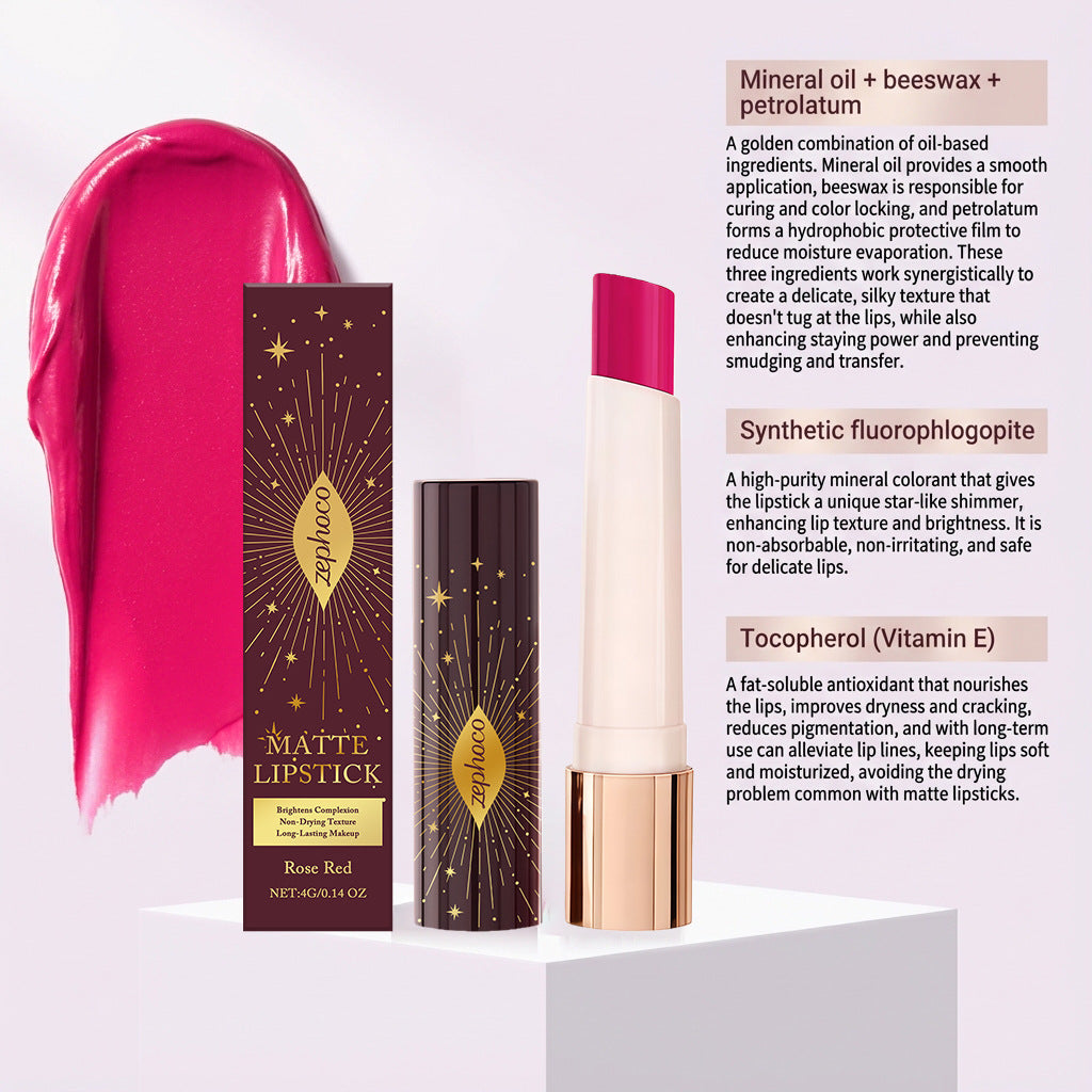 Le rouge à lèvres mat Zephoco offre une couleur riche et facile à porter, avec un fini mat lisse, conçu pour les maquillages de tous les jours.