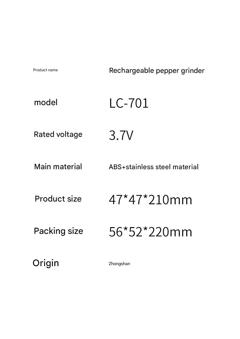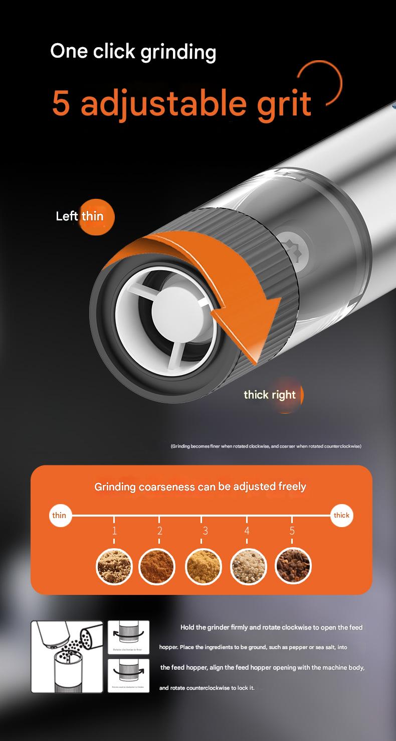Upgrade your kitchen routine with this rechargeable electric pepper grinder designed for convenient and controlled seasoning. Featuring one-button operation and adjustable coarseness, it allows you to grind pepper, salt, or other spices easily according to your preference.