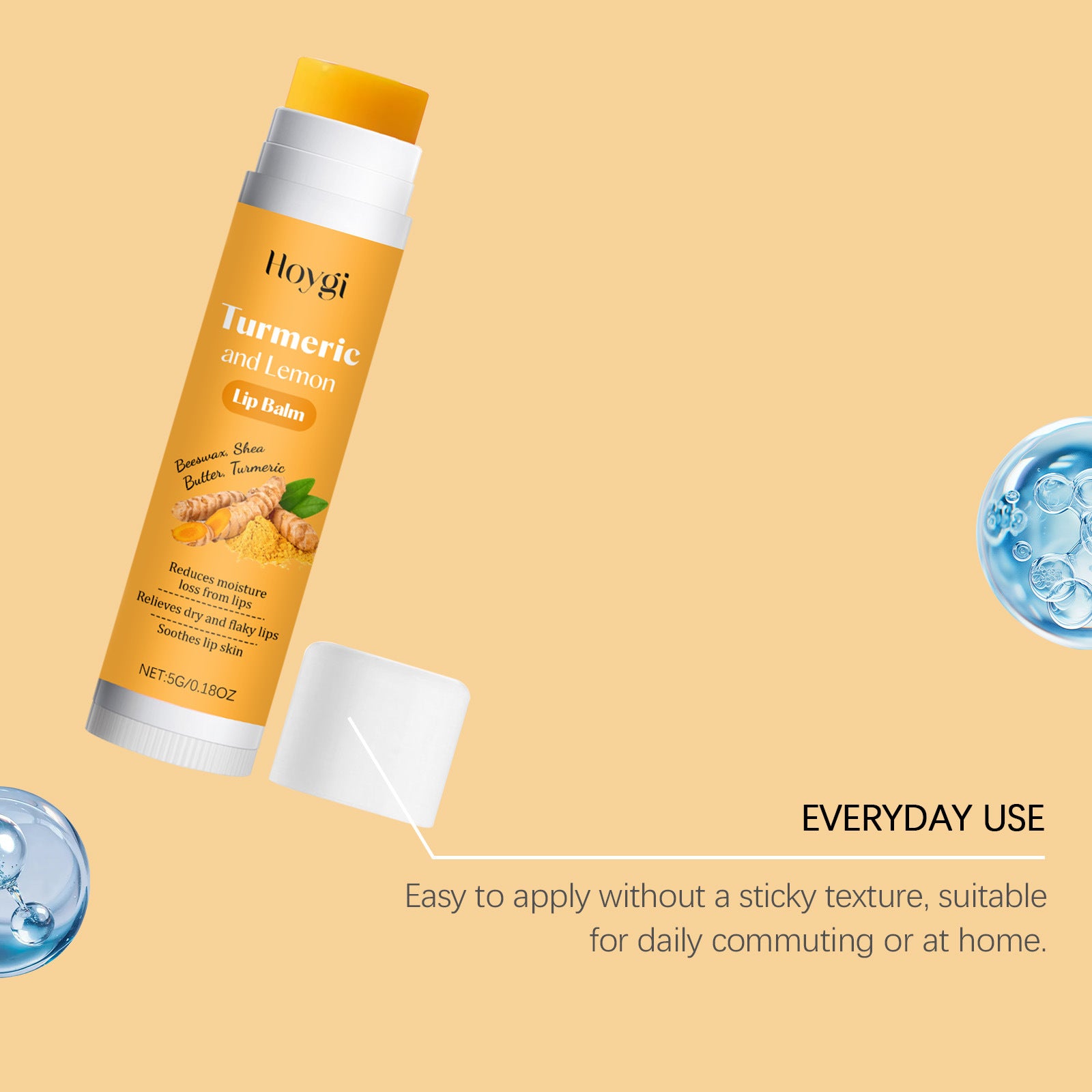 Hoygi Turmeric & Lemon Lip Balm features a smooth, lightweight texture designed to glide easily across the lips without a sticky feel. Formulated with beeswax, shea butter, and turmeric extract, it helps support lip comfort and softness during regular daily use.