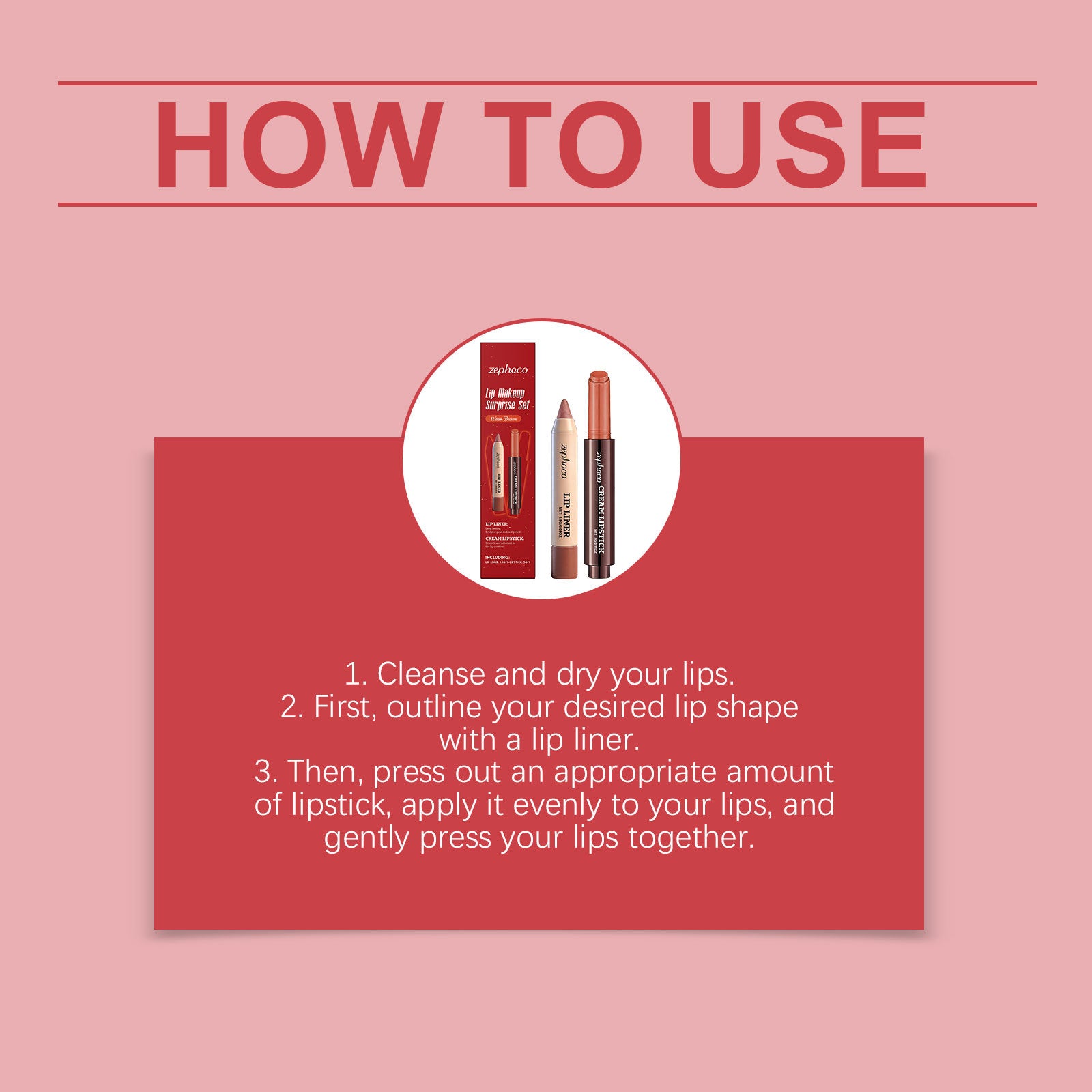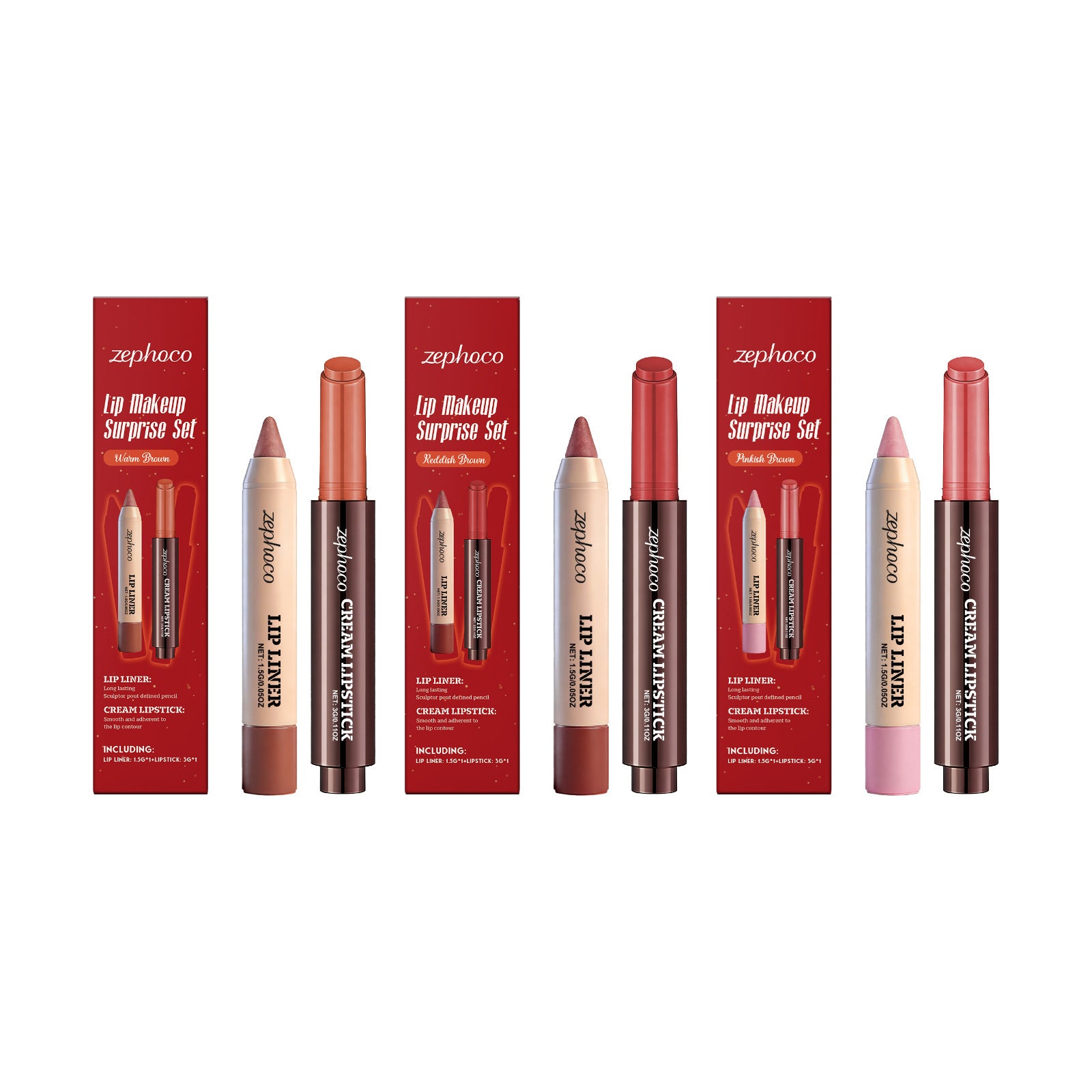The Zephoco Lip Makeup Surprise Set includes a creamy lipstick and a soft-texture lip liner in coordinated shades designed to complement natural lip tones.