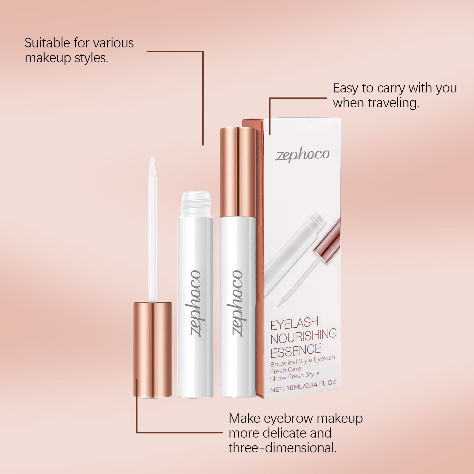 The Zephoco Eyelash Nourishing Essence is a lightweight, transparent serum designed for daily eyelash and eyebrow care.